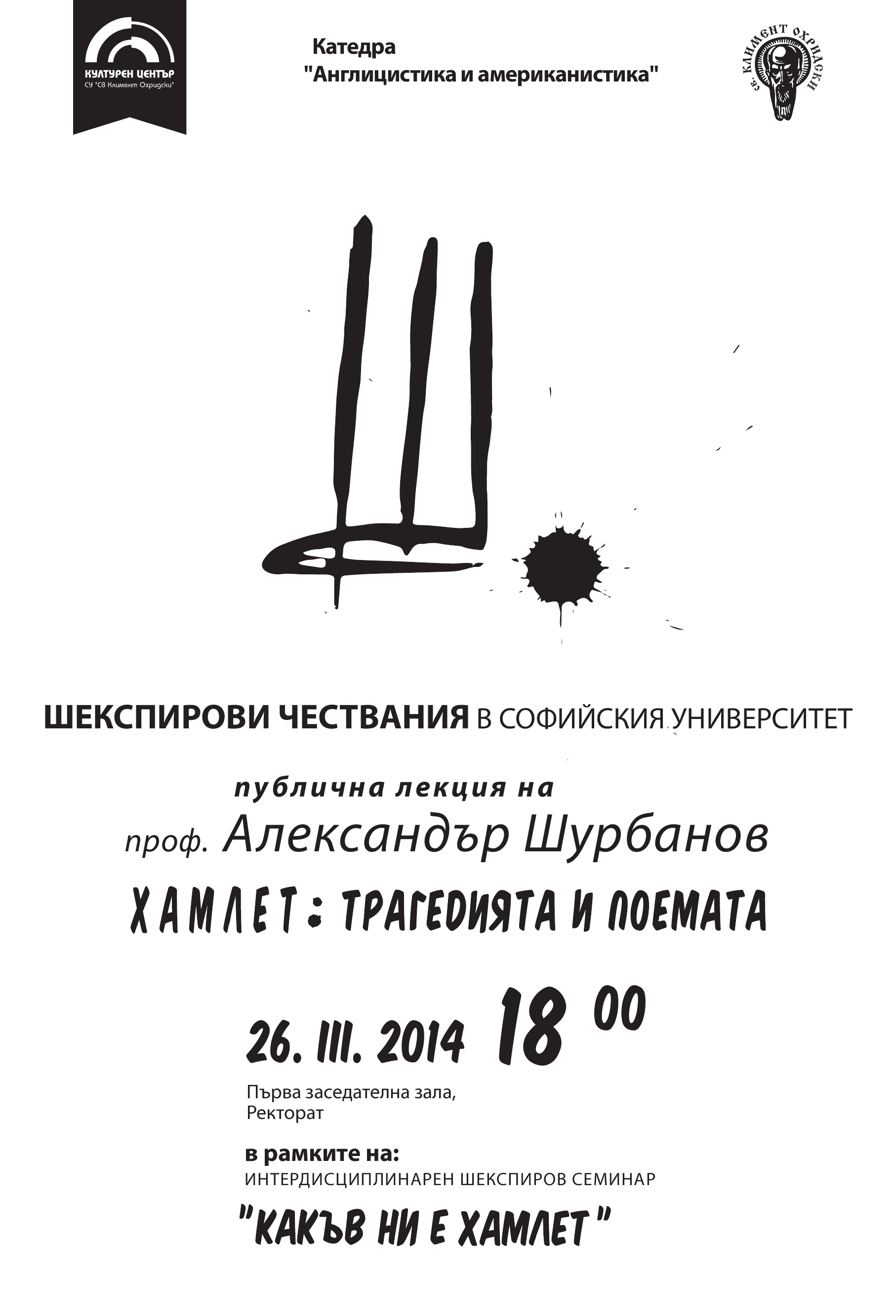 Катедра „Англицистика и американистика” и Културният център на СУ „Св. Климент Охридски” представят публична лекция на ПРОФ. АЛЕКСАНДЪР ШУРБАНОВ в рамките на ИНТЕРДИСЦИПЛИНАРЕН ШЕКСПИРОВ СЕМИНАР „КАКЪВ НИ Е ХАМЛЕТ”.