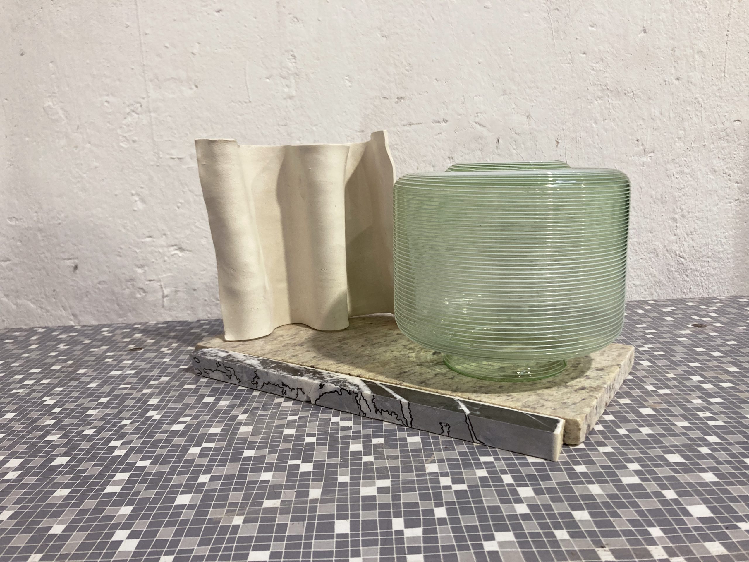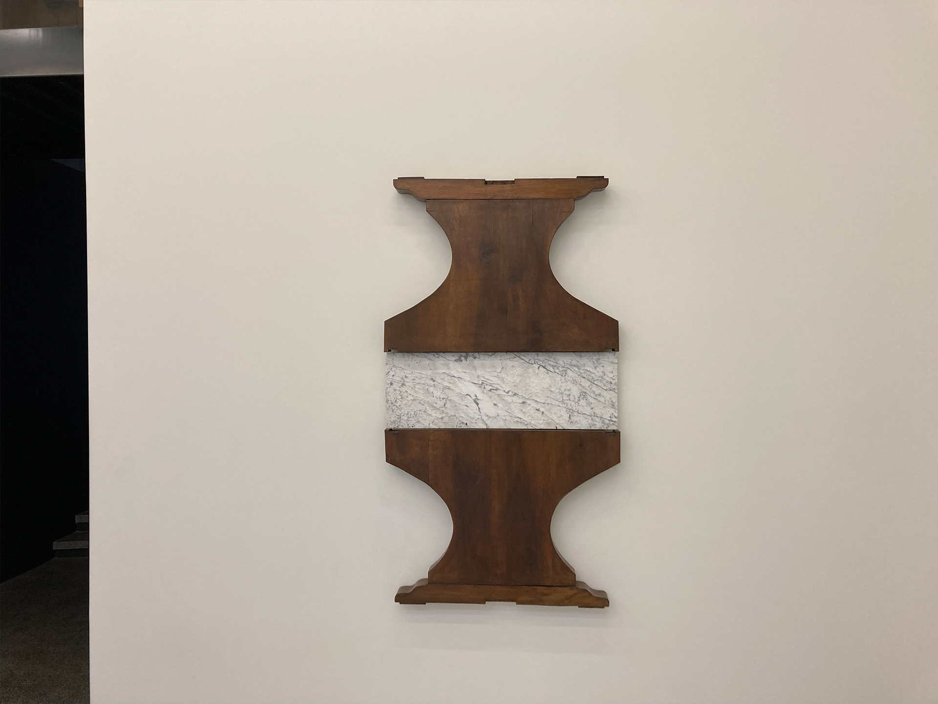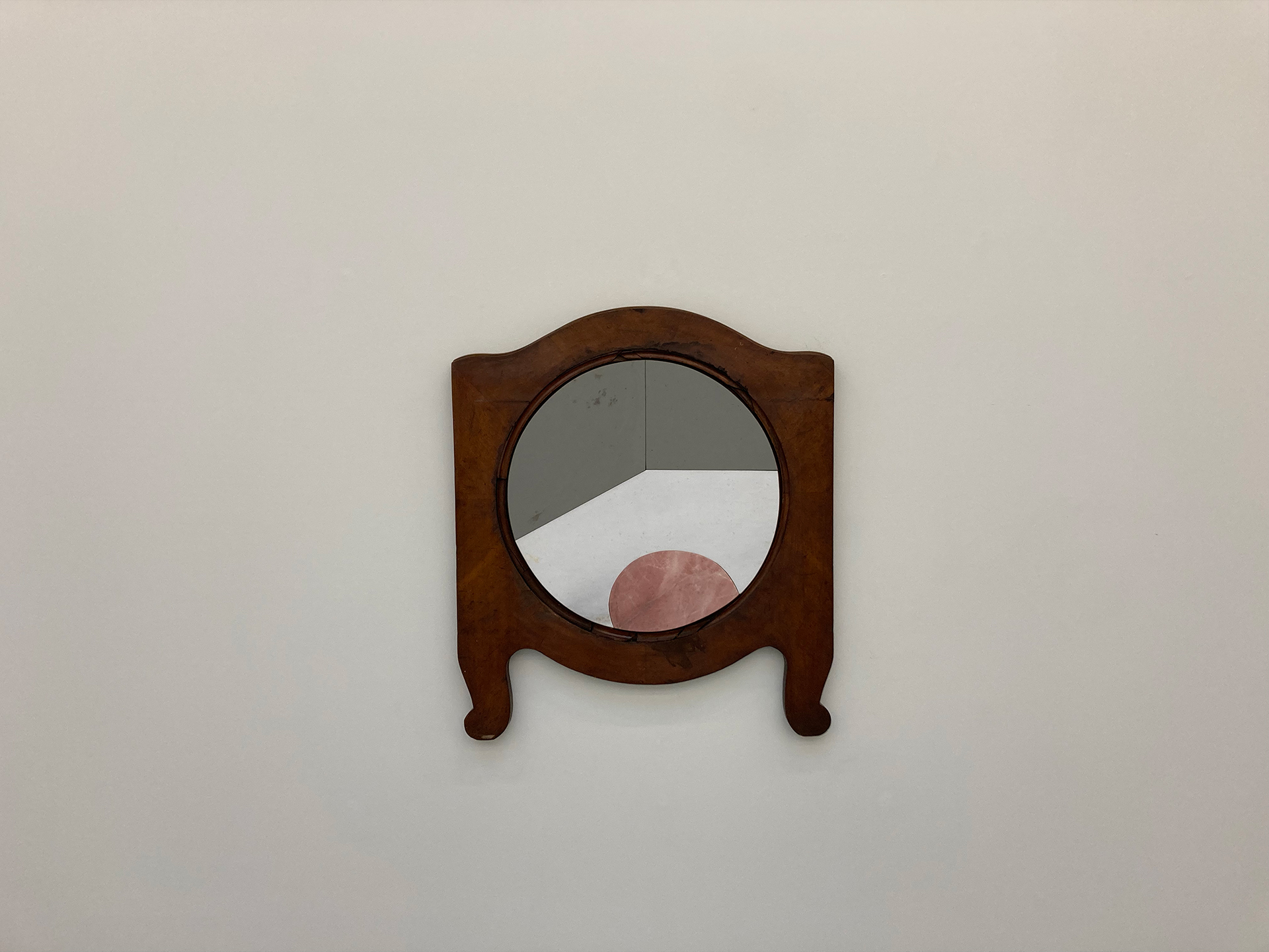 Разделени са нещата в „Огледалото“ – следващият обект от дърво и камък. Меката сфера от дървена рамка привлича погледа още с влизането в галерията, но страхът от тази среща с отразеното налага обхода и отлагането ѝ. Очакването не предлага очакваното. Няма образ, а се измисля такъв, който се явява перспективно подобие от камък на пространството срещу „Огледалото“. Изобразителната трансформация е болезнено разминаване с невидимостта на собственото лице. Реалността е там, но не е достъпна, а се привижда през парчета мрамор и късове камък. Видимото се оказва само мимезис на живото, оградено с разпознаваеми части маса, крака, рамка, облегалка, но лещата на окото събира лъчите в каменното огледало и препраща към неявния образ на смъртта. Въпроси притискат, отговори не идват.