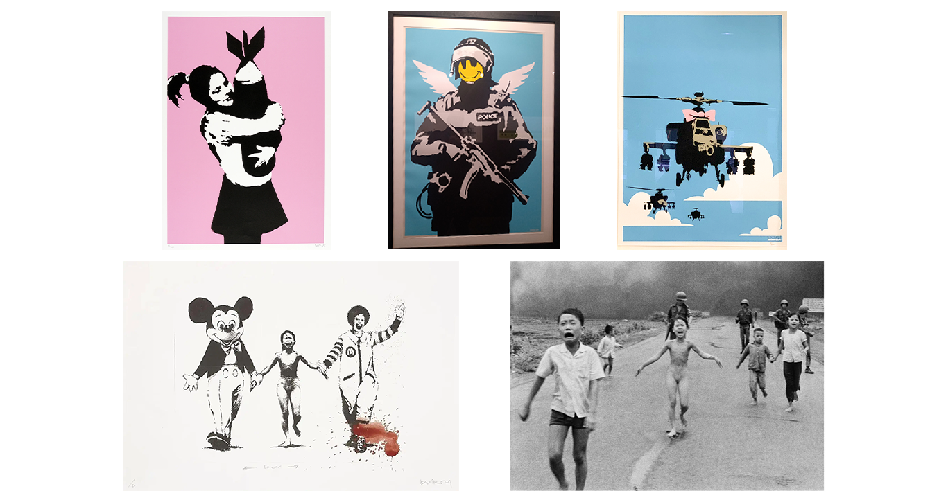 Долу вляво е „Напалм“ на Банкси, а вдясно до него просветващият „зад“ графита първообраз – прочутата фотография от времето на Виетнамската война на Ник Ът „Ужасите на войната“, или „Напалмовото момиче“, 1972.