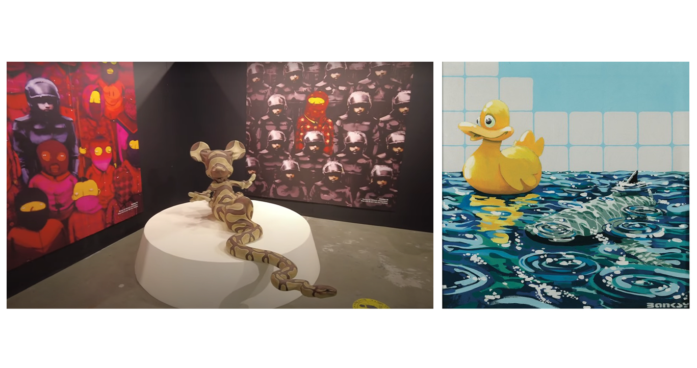 Горкият Мики Маус беше станал Mickey Snake – ужасната анаконда се проточваше напред, втренчена в зрителя, докато междувременно в съседната картинка ядрени подводници миролюбиво изплуваха във ваната до гумени патета. Контрастите между визуални и идеологически репертоари бяха подчертани и от двете ясно различими цветови гами, които ту се смесваха, ту се отделяха: агресивният ярък колорит на рекламната индустрия срещу черно-бялата стенсил eстетика на графитените подписи на нелегални момченца и момиченца.