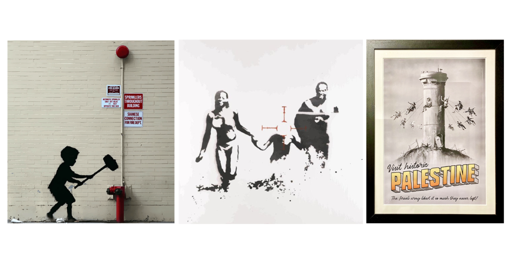 Да, картините показваха как Банкси е бил някъде там, навън – беше се забавлявал, омесвайки холивудската шарения и черно-белия саботаж на силуетите, вдигайки цените на недвижимите имоти[2]. И ето го сега вътре, в рамка, драги зрители – радвайте се на любимото на всички малко момченце-сянка, което с нарисуван чук ей така, просто на шега разбива светая светих на американската сигурност и градски ред – пожарния кран. Ето го и щастливото семейство, което като Афродита от пяната излиза от морето, хванало за ръце своето мишенце (мишена+детенце). Ето я и Палестина, въртележка на смъртта.