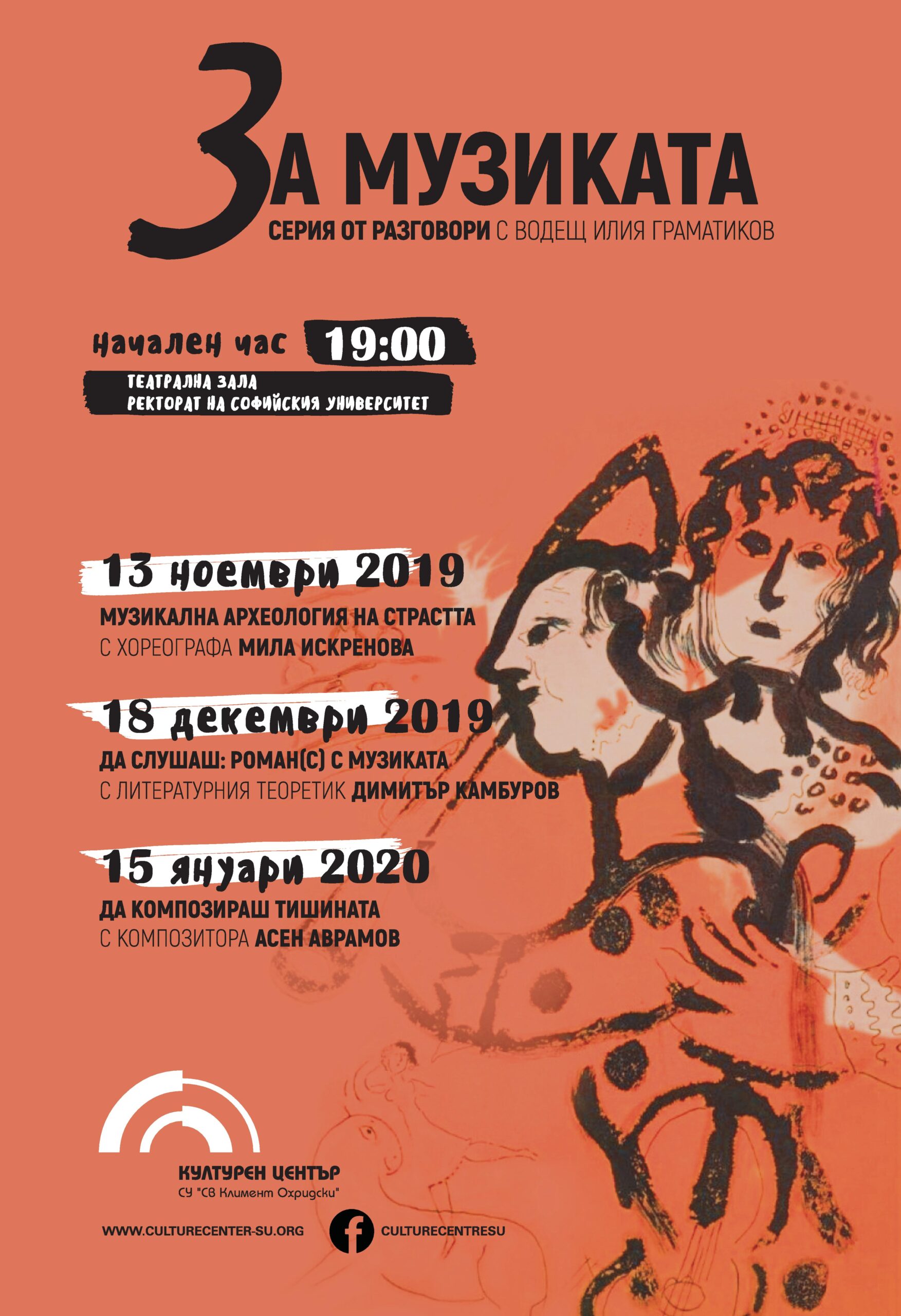 „За музиката“ е диалогичен формат, чиято цел е да даде възможност да мислим, слушаме и разговаряме за музика по начин, който не е затворен нито в „закодирания“ строго професионален език, нито в чисто любителската битка на вкусове.
