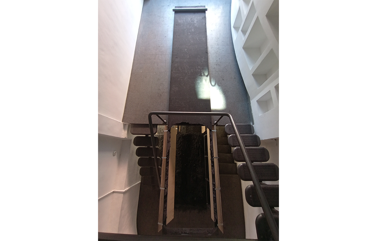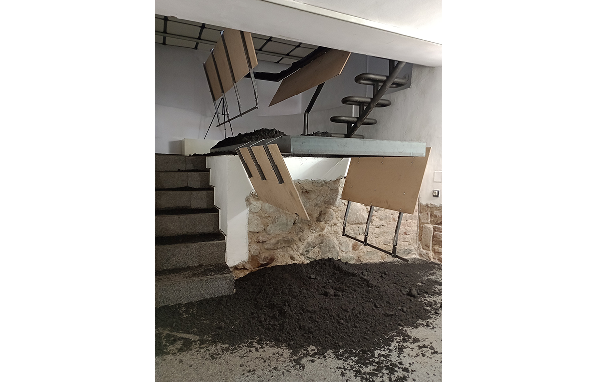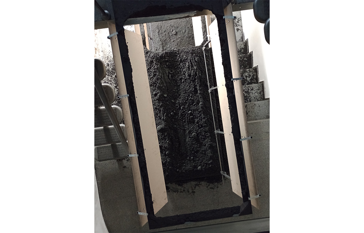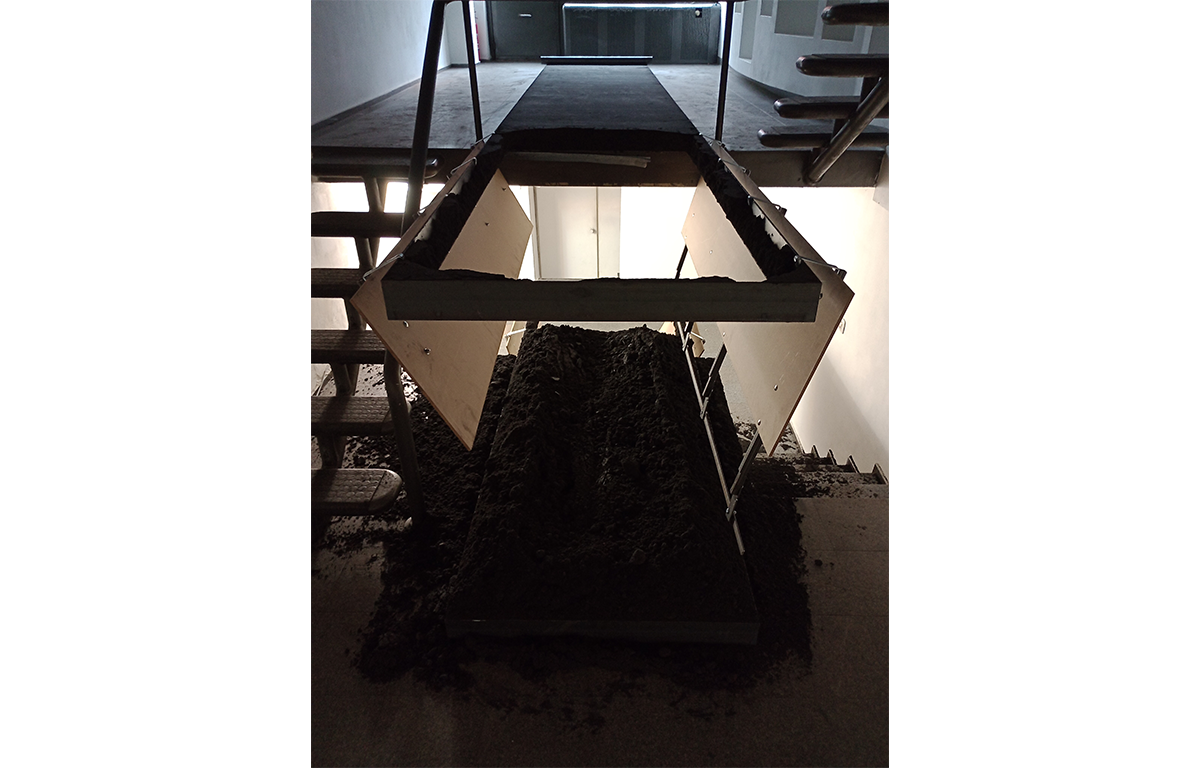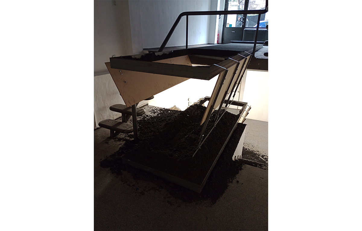 В това неудобно пространство Ивайло Аврамов е разположил две метални кофражни каси с правоъгълна форма, пълни с валиран инертен материал (въглищен прах). Едната каса е два пъти по-голяма от другата. Голямата каса е разположена в средата на пода на кота 0 в галерията и стърчи с една трета от своята дължина над кота -1. На това ниво е поставена по-малката каса, точно под голямата. Тя стърчи също с една трета от дължината си над кота -2, най-ниското ниво на галерията. Инертният материал от голямата каса в частта, изнесена напред, над кота -1, се е струпал върху малката каса. Инертният материал от малката каса в частта, изнесена над кота -2 се е струпал на пода. Капаците на дъната на касите са били отворени в един момент и материалът се е изсипал. Те са оставени да висят отворени, подчертавайки движението на пропадането. Получил се е ансамбъл от елементи, изработени от един и същ материал с еднаква форма, но с различна, пропорционално съотносима големина. Тези елементи са частично разрушени под напора на гравитацията. Разрушението едновременно е отнело и добавило материал, променяйки формата на елементите и на интериорното пространство около тях. Виждаме игра на повторение и различие, на симетрия и асиметрия. Произведението е синтез на класическите характеристики на красотата – пропорция и симетрия – и тяхното пълно отрицание. На екзистенциално ниво работата предизвиква тревожност, защото отворените капаци напомнят на тези под бесилките, използвани за публични екзекуции в миналото, а купчините въглищен прах имат силуета на пресни гробове. Красота и ужас едновременно.