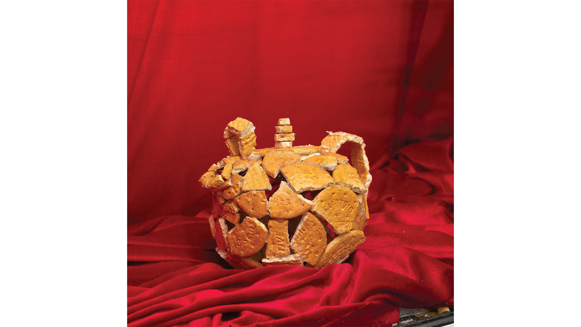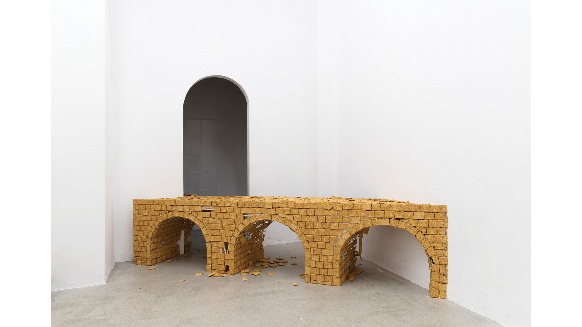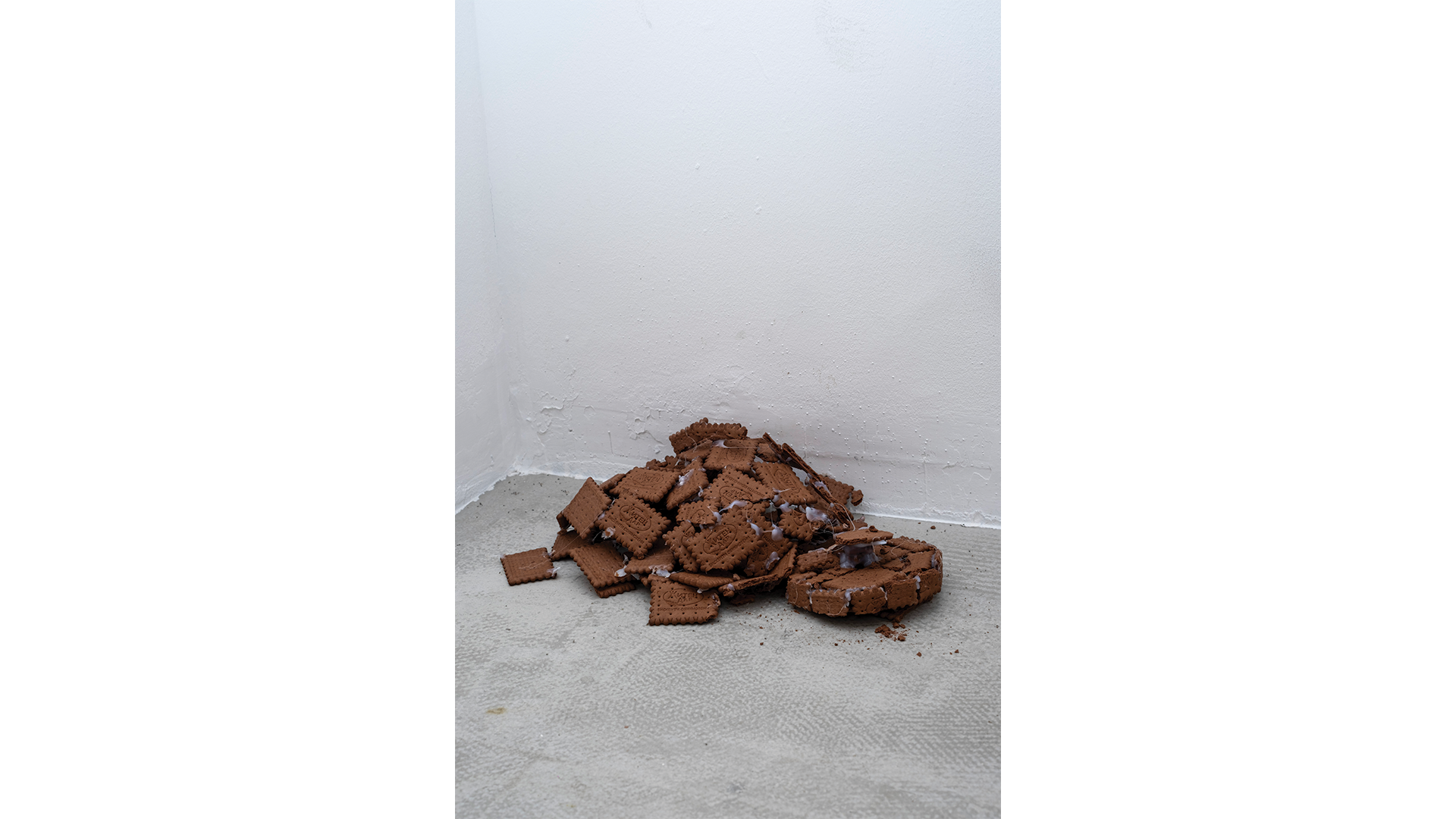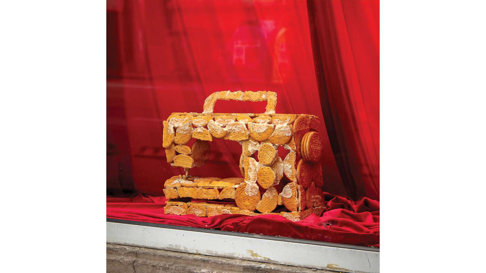 В изложбата си Кoрe Франг работи с… бисквити (оказва се, крайно богата художествена медия с наситен културен код). В галерията някак нахално се разполагат един климатик, един впечатляващ мост (като на Кольо Фичето) и един глобус, приближаващ се до двуизмерността. На витрината пък импозантна червена кадифена завеса обгръща една шевна машина и един чайник. Всички обекти са маниакално изградени от модулни плочки бисквити. В последните дни на изложбата почти всички обекти бяха в напреднал стадий на разпад с голямо количество изпопадали на пода парчета – материален процес на ентропия, който умело „завършва“ намерението на художника да съчетае материалността на обекта с естествения процес, но не по производството на обекта, а на неговата дезинтеграция, на постепенното му превръщане във времетраенето на изложбата в руина. Всички познаваме бисквитите „Житен дар“ до степен дори да не четем името, а както Барт анализира, то е пълно с културен подтекст – интегрална част от прехраната на почти всички народи от дълбока древност, елемент с ритуална наситеност (при Петър Дънов житото има сакрално значение). Украинската сделка за износ на зърно през Черно море ни посочи важността на житото в глобалните икономически и политически мрежи. Екологичната катастрофа пък ни припомни за риска пред изхранването на населението при застрашения добив на този ценен ресурс. Бисквитите, от своя страна, са junk food, богати на химически добавки, символ на бързата консумация и вината, свързана с практикуването ѝ. Но преди всичко – качеството, което очевидно има огромно значение за автора, е тяхната крехкост, нетрайност и ронливост.