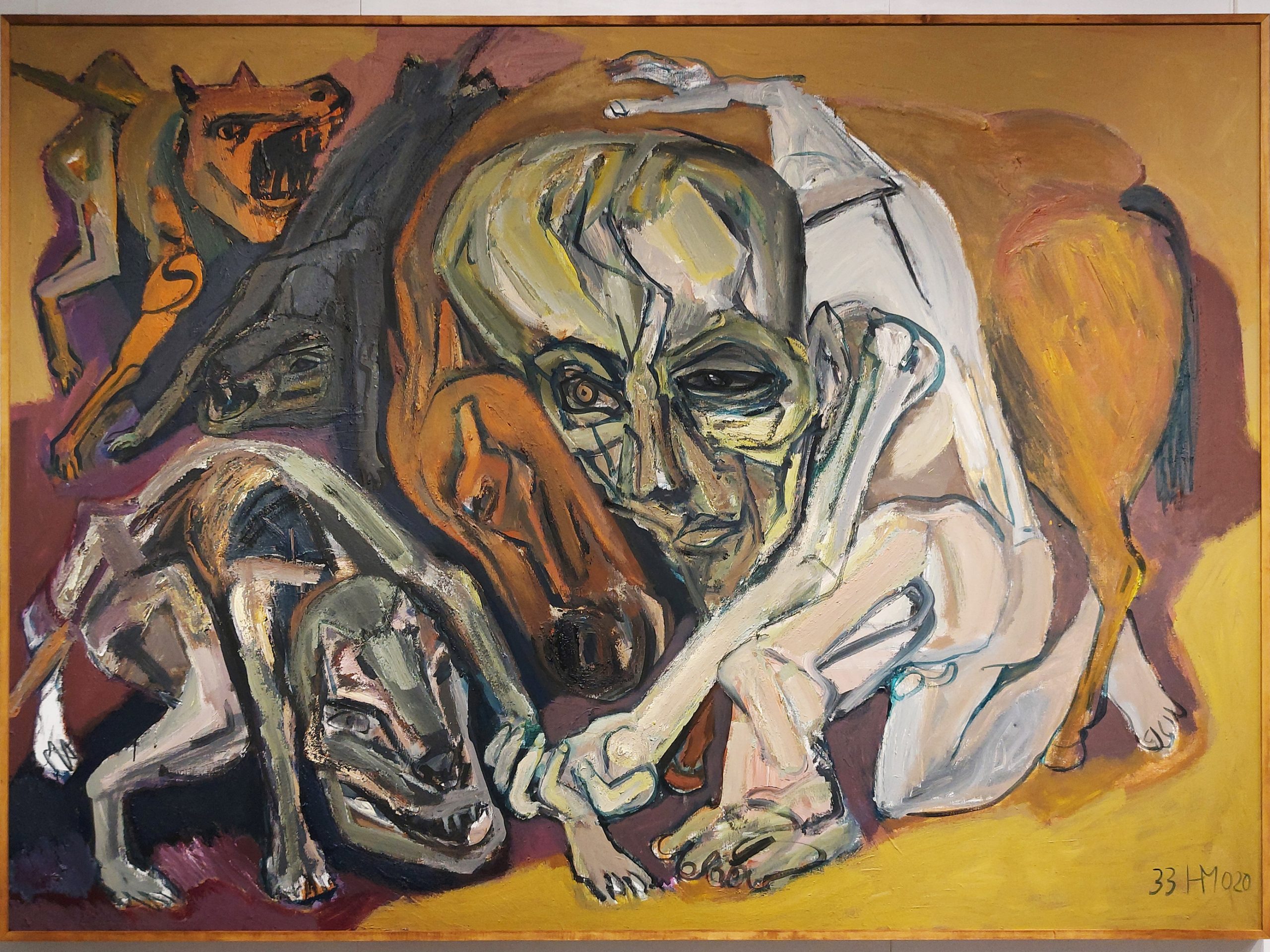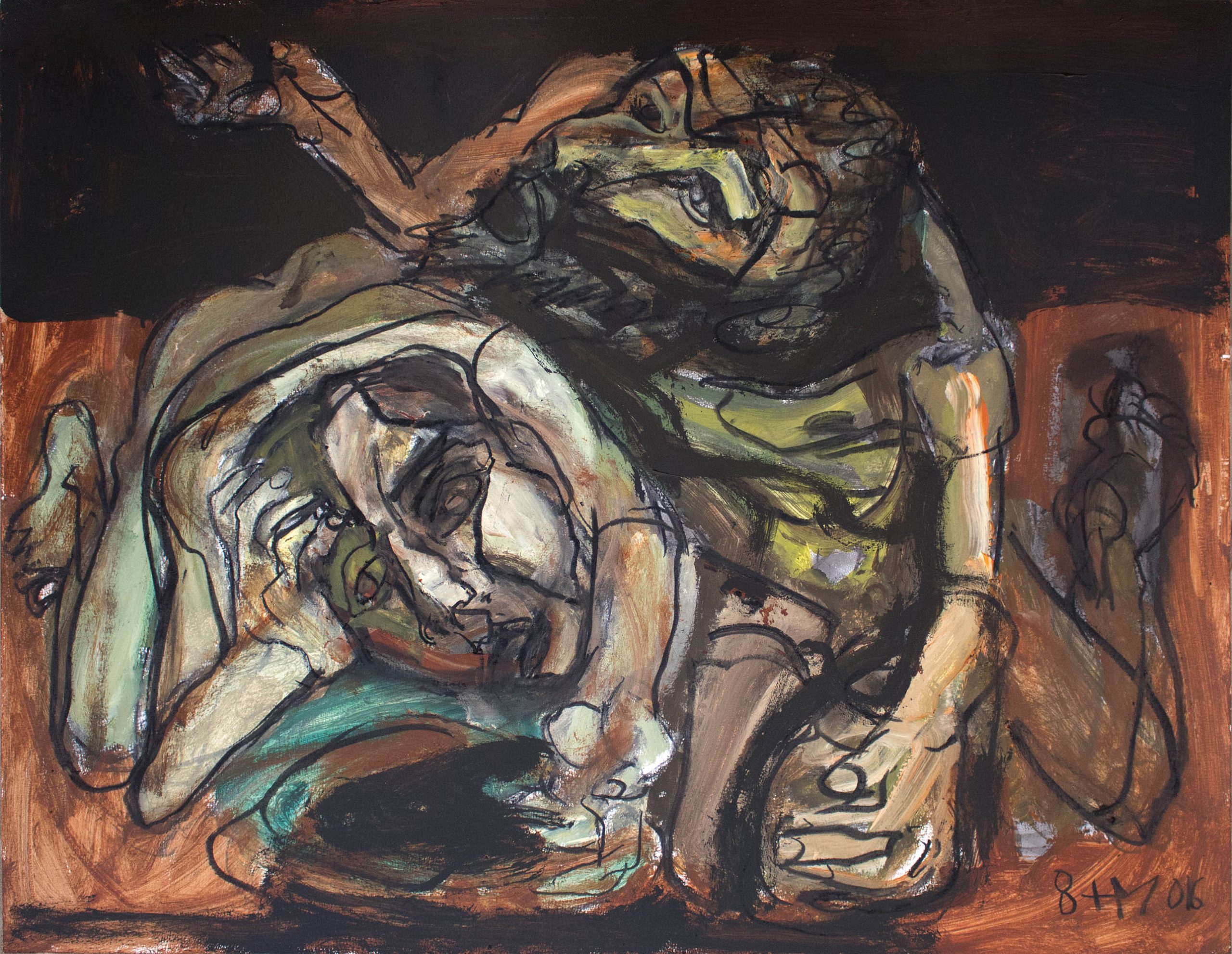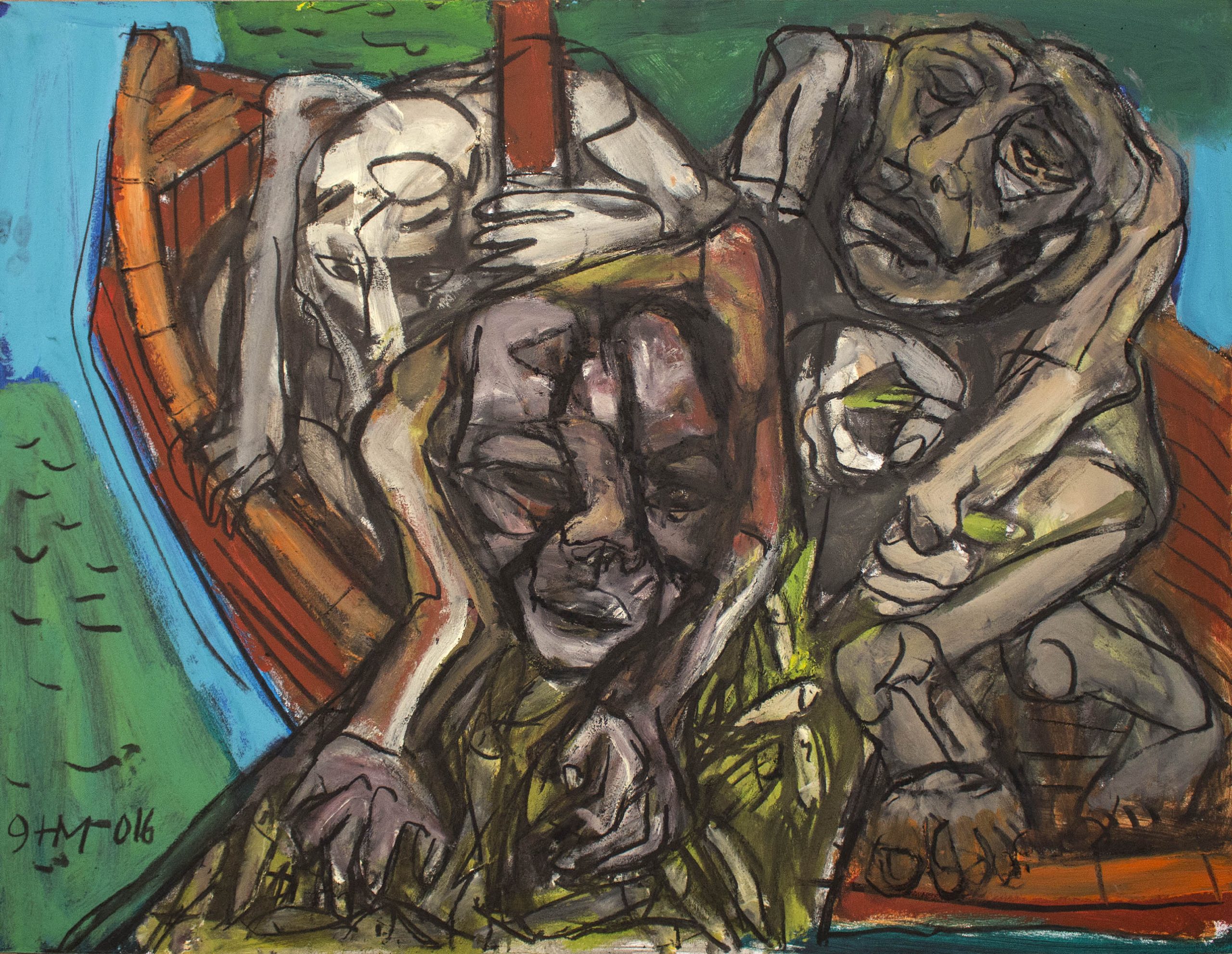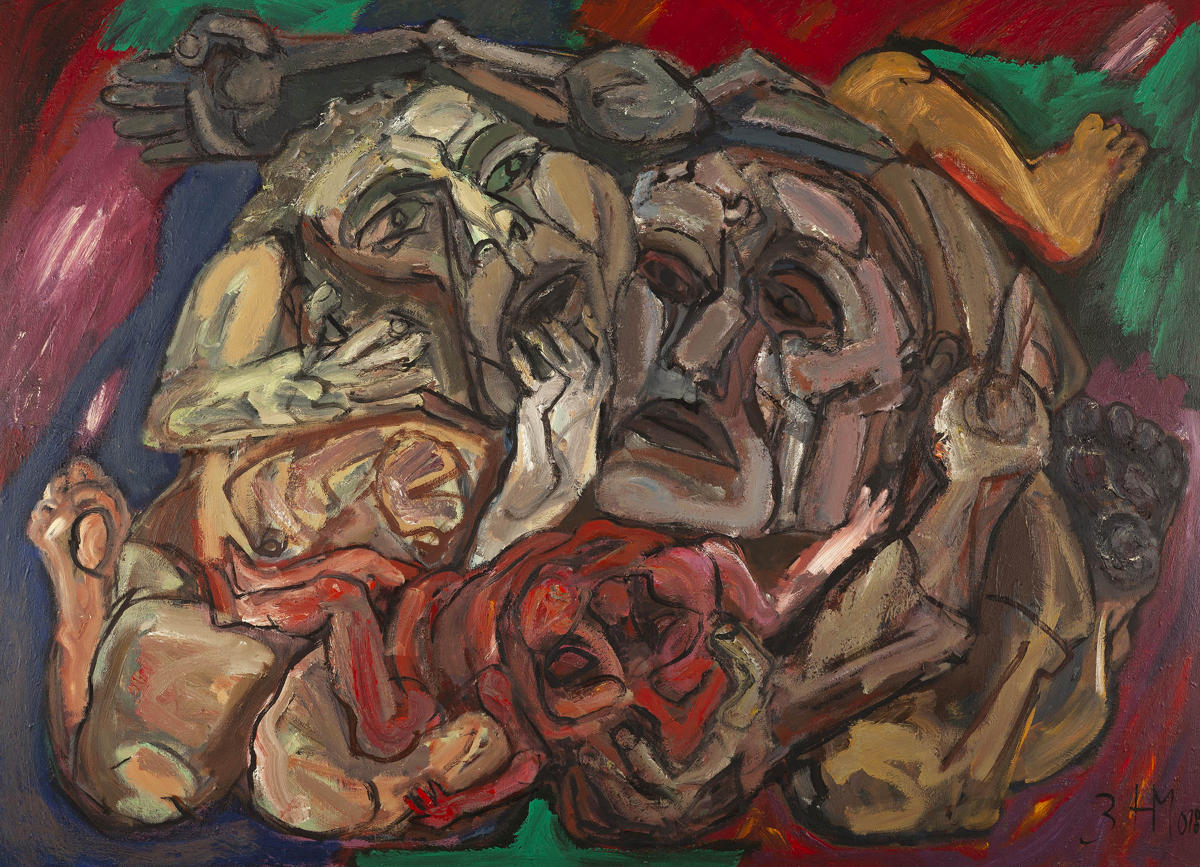 Всички фигури, населили тази странна вселена на Майсторов, са скупчени заедно, сгърчени, смазани от непосилна тежест, притискащи се в отчаян жест, а Христос ги поучава, изцелява, съпътства в неистова прегръдка, в поза, надвесена над тях досущ както се надвесват Страхът, Смъртта. И така, мултиплициран платно след платно, занемелият вик на ужас и трепет на Майсторов сякаш свежда онзи на Мунк само да тих шепот. Въпреки усещането за безвремевост, за застиналост, тези прекомерна страдалческост, низвергнатост, напрежение и ужас, препращат към идеята за изложбата като коментар на времето, в което живеем – време, оказва се, в което не можем да срещнем погледа на Бога, Той гледа през нас.