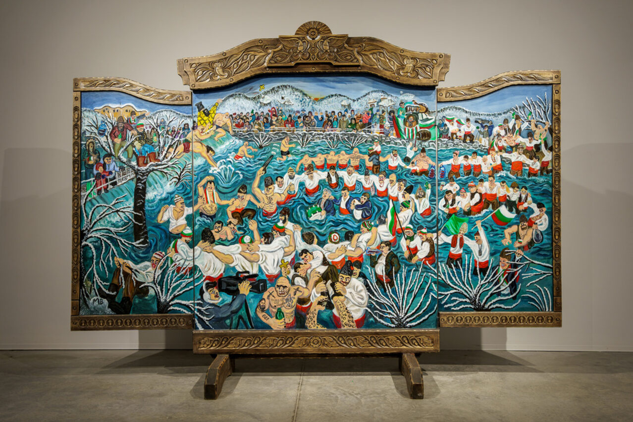 В ренаратива на приказките и легендите ни отвежда, от своя страна, Мартина Вачева с изложбата си „Влачугане“ (Галерия Топлоцентрала – Куб). Тук вече решително сме напуснали селенията на фактите, архивите и научния подход, за да попаднем сред митологически типажи като поганци, караконджули и всякакви страшилища и „мръсни духове“, само за да открием, че те всъщност са получили своето съвременно издание в „блатото“ на съвременната култура – превърнали са се в „мафиоти“, „псевдопатриоти“, „мачовци“ и автори на „измислени“ традиции, танцуващи хоро в ледените води на Йордановден, а не като едно време – само „газещи“ в тях, както повеляват етнографските справки, които авторката цитира. Изложбата ни представя една идеализирана представа за миналото, превърнала се в безпрекословен аргумент за разгромяваща критика на неговото опорочаване и изкривяване от настоящето. Тази безапелационно крайна и едноизмерна позиция, заредена със завиден жар и плам и подплатена от безкрайно гротескния стил на авторката, веднага кара човек да се запита има ли на практика не-измислени, не-изобретени традиции, спуснати ни свише или естествено вградени в ДНК-то ни. Ситуирането на внушителните платна и инсталации в безвремието на т.нар. мръсни дни цели поставянето ни в контекста на карнавала, но тук далеч не сме в Бахтиновия свят, паралелен на официалната култура, няма го неговия пречистващ и обновяващ свещен смях на временното преобръщане на йерархиите. „Блатото“ е изпълнено с бълбукаща жлъч и хапеща ирония. Краткото потапяне в него при посещение на изложбата поражда импулсивното желание у зрителя отново и отново да се уверява във възрастта на авторката, обявена за „млад творец“. Трудно е да се повярва, че и Вачева е една от милениалите, дотолкова езикът, на който ни заговаря, е безкрайно познат от дискурса на пасажерската седалка на всяко второ такси или на всяка втора пейка в малко градче. Авторката се е въоръжила с езика на онези, които критикува, само че е пренасочила мерника.
