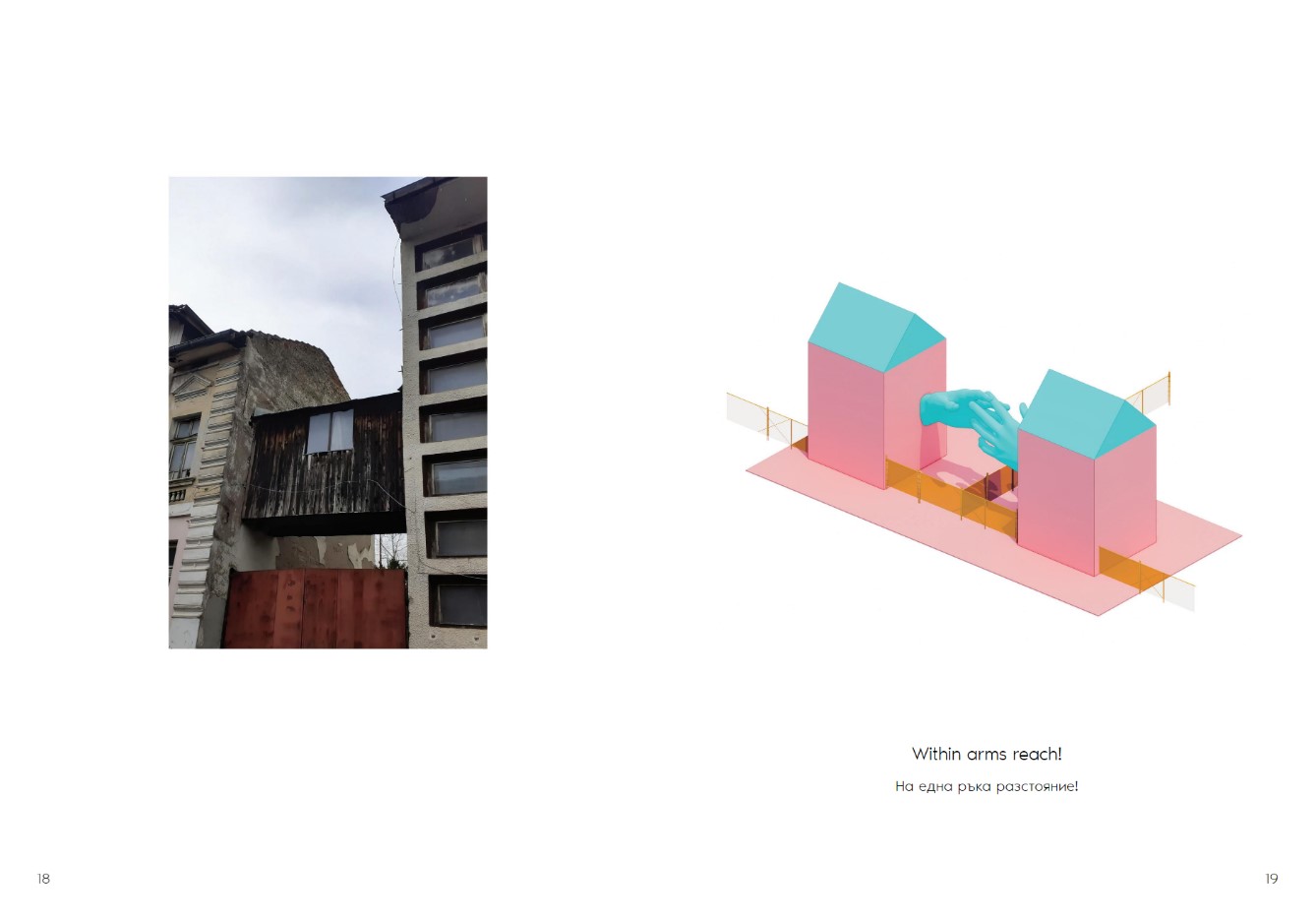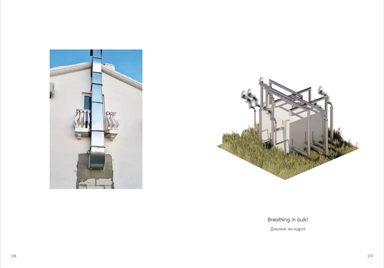 В съпътстващото изложбата авторско книжно издание хетероклитните злополуки на импровизирания строеж са третирани със солидна доза комизъм: пред погледа изникват еркери със зазидани прозорци или врязани в тесните пролуки на срещуположни сгради; щурцове, преграждащи цели фасади; покриви, стърчащи между етажи; водосточни тръби и комини, щурмуващи балкони; дисфункционални скулптури, препречващи входове; хибридизации от ръбести и овални релефи; мозаечни сплави от каменни зидове, дъсчени прегради и тухлени стени; дистопични агрегати от стълбища, навеси, тръби, решетки, кабели и климатични инсталации всред сутерени и безистени – всевъзможни своеволни построения, рожби на истеричното нетърпение и хроничната умора, където неведението и паратехническите безумия си подават ръка, за да образуват покъртителните и фасциниращи проекции на едно архитектурно въображаемо, които в естетически план могат да се сравнят единствено с болестотворните фантазми и изтерзани сънища на ранните експресионисти. Авторите удвояват всички тези образи със свои дигитални „меме“-графики, правейки абсурда възможен за въобразяване чрез алтернативния модел на хумористичния шарж. Те прекрасно улавят тъкмо миграционния профил на града – потребителите идват и си отиват и в този непрекъснат ход всеки един от тях оставя следите от своите безчинства, съгласуващи се с текущите политически и икономически премеждия. При все това хуморът е хаплив и двусмислен – става дума не просто за причудливи зрелища, а за реални и незаобиколими проблеми, чието пренебрегване се превръща в обичаен климат на културната психология. Временните и нестабилни конструкции са не просто рефлектори на фрустрираната нужда от житейски уют, но и детерминанти на един твърде устойчив и резистентен модел на безотговорност към самата среда като условие за живот. В този ред на мисли изложбата до голяма степен заличава романтическия ореол около фигурата на фланьора, който в своите мечтателни разходки поетизира градските пространства в образи на другостта. Тук той е заменен от ироничния шегобиец, чиято наслада произтича от карикатурното удвояване на съществуващото – екзотичното бива сведено до баналността на твърде познатото.