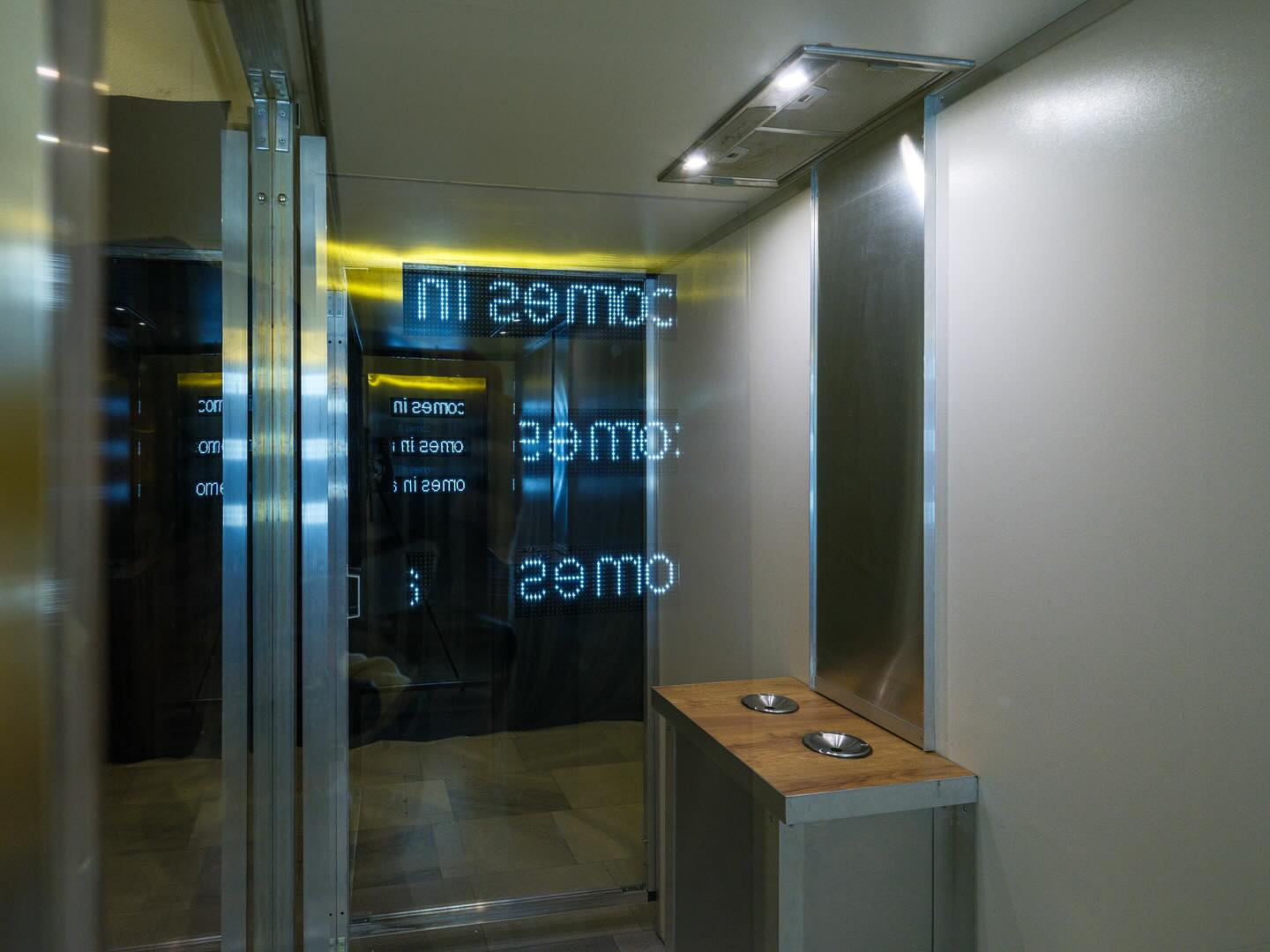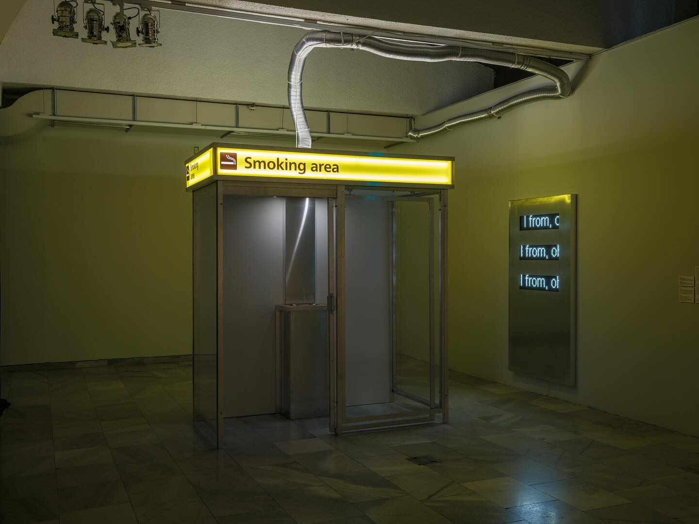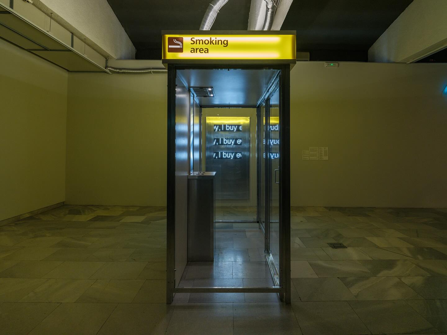 Връщайки се към работата на Аарон Рот, пушалнята в случая не е просто реконструкция на едно функционално пространство. Чрез LED дисплея с текста на Цеца тя се превръща в диаграма на балканската екстратериториалност или поне себеидентификацията с периферния характер на региона. Тук глобалната циркулация среща локалната културна индустрия на национализма от 90-те. В този смисъл работата на Рот не просто възпроизвежда реалността на терминала, а я сгъстява в конфликтна точка, в която клишето „забранено пушене“ едновременно се явява и артикулация на една позната ни до болка постполитическа позиция, която често остава абсурдна за нас именно заради факта, че тотално се е пропила в балканския субект.