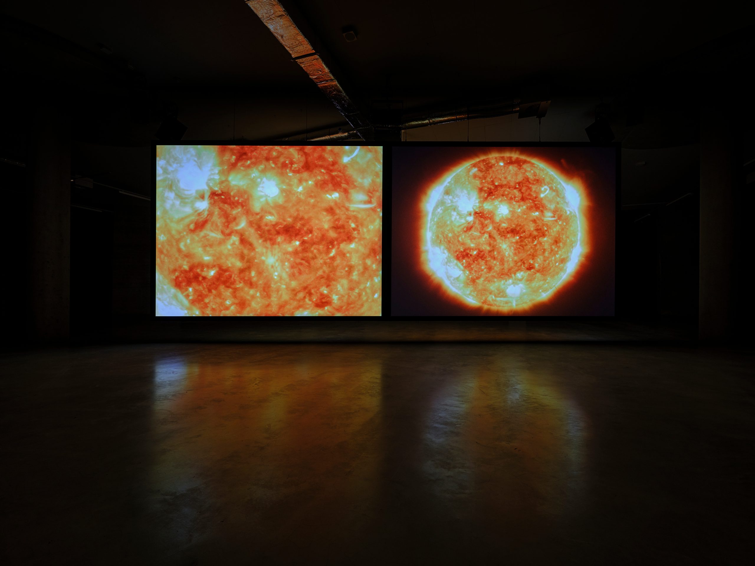 Начало и край се сливат в цикличните повторения на половинчасовото многоекранно видеоесе, а рамкиращият образ е слънчевата повърхност (кадри от НАСА). Слънцето е главният виновник за живота на Земята, но и за разделението на цветове и кожата. В тъмното нищо такова няма значение.