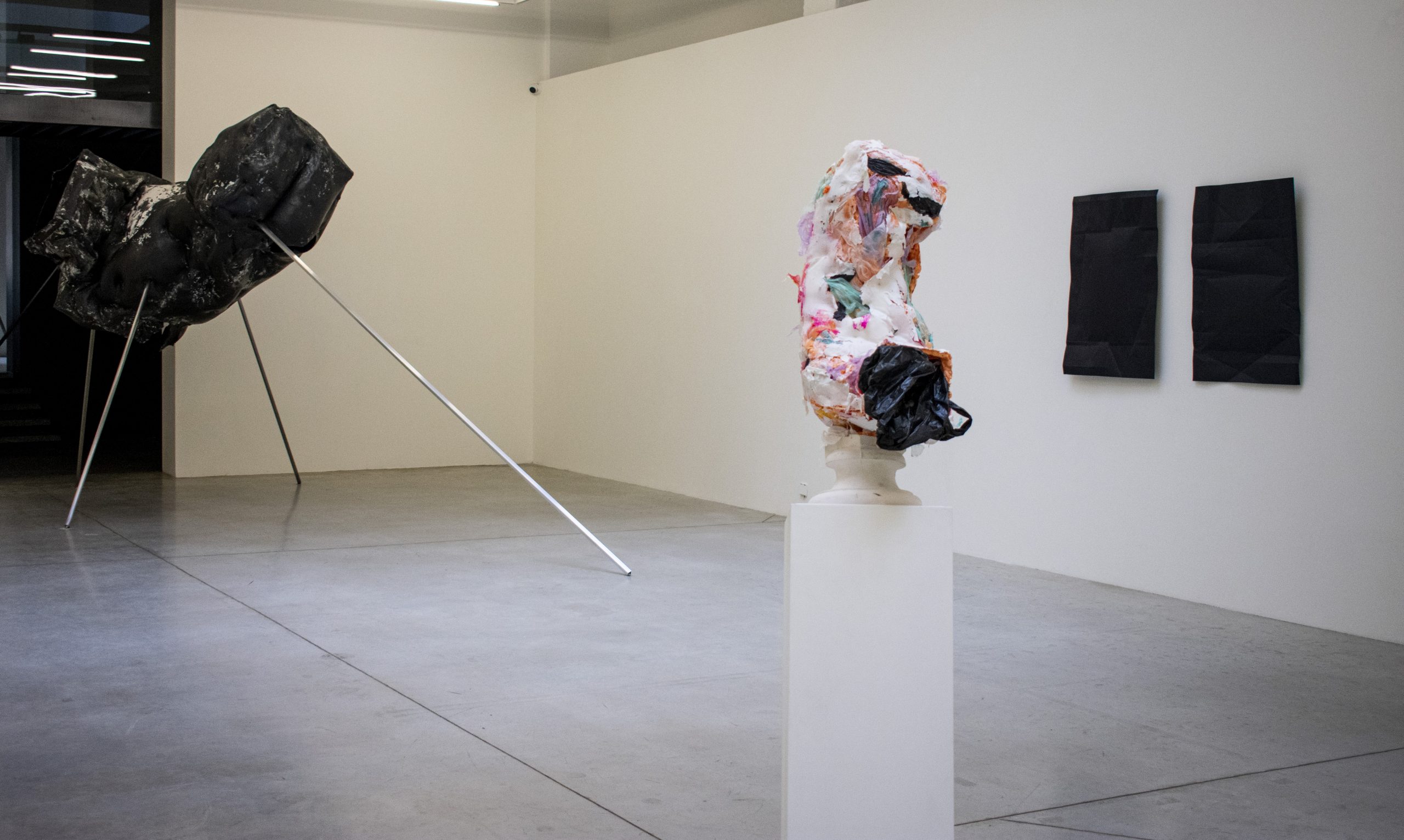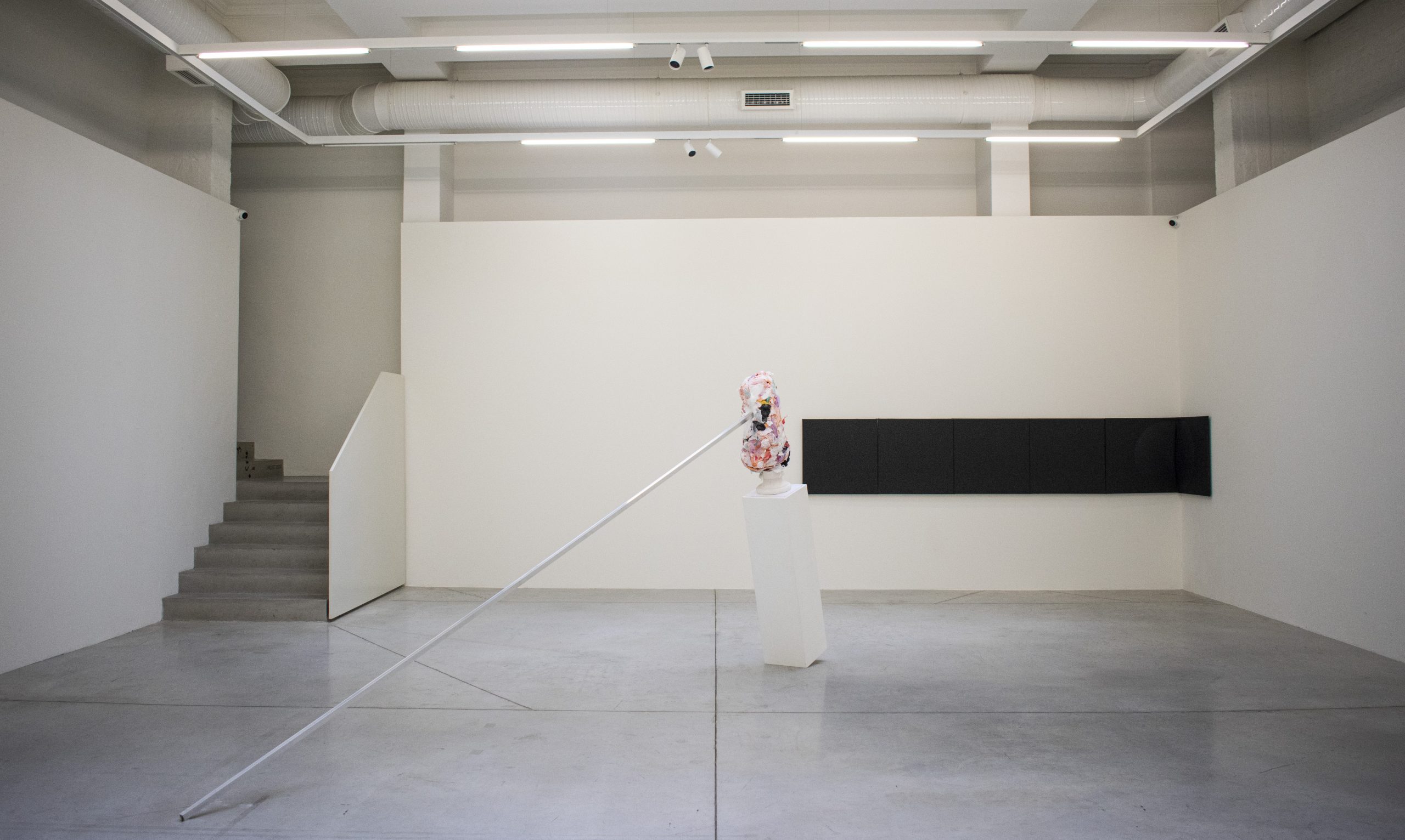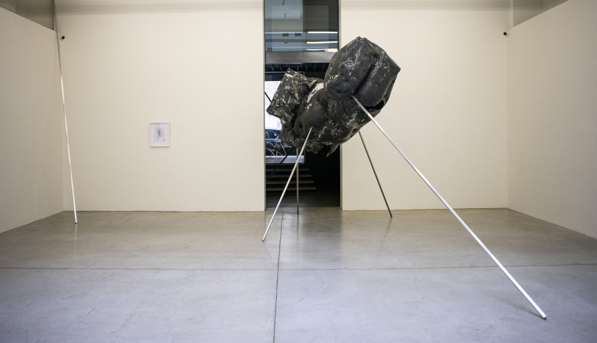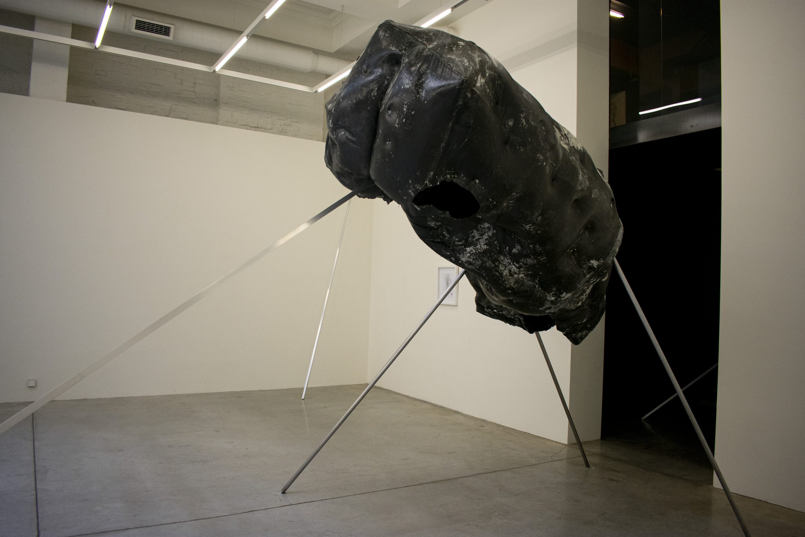Още с влизането пред погледа надвисва огромно тяло от тъмна материя, което пресреща посетителя със своето произволно разположение с оглед на останалото геометрически фиксирано пространство на галерията. Изниква момент на реципрочност: тялото на посетителя, което се стреми да се провре във вътрешността на галерията, е удвоено от тялото на експоната, чието безформие сякаш му пречи да излезе през отвора от прави ъгли. Самата фигура кръжи неопределено над равнището на пода. Подпорните конструкции, които я поддържат във въздуха също имат неясна функция – те едновременно поемат нейната тежест и спират полета ѝ. Действително, трудно може да се определи дали става дума за инертно неорганично тяло, което е деформирано от действието на външни сили или за безтегловно, меко, органично тяло, чието безредие е резултат от вътрешни процеси. Онова, което със сигурност е установено, е стълкновението на тези вътрешни и външни сили, чиито посоки и въздействия обаче са така преплетени, че не е възможно да бъдат определени като физически величини. Самата фигура наподобява обезобразен орган, но в един от своите аспекти тя се трансформира в отвор с неестествена, квадратна форма, сякаш за да се нагоди към околната геометрия. Скулптурата присъства, но от нея е свлечена аурата на изобразяването; релефът е осезаем, но е изтръгнат от природния си контекст. Възприемането на това тяло е разцепено между естественото и интелектуалното зрение, продуцирайки колебание в самата физика на пространството, която се възвестява не като сбор от изчислими отношения, а като неразрешима загадка – погледът е принуден да разпознава ту присъствието на някакъв предмет, ту пространството около това присъствие, но двете не се обвързват в ясно отношение, а взаимно се отблъскват от силите на напрежение помежду им.