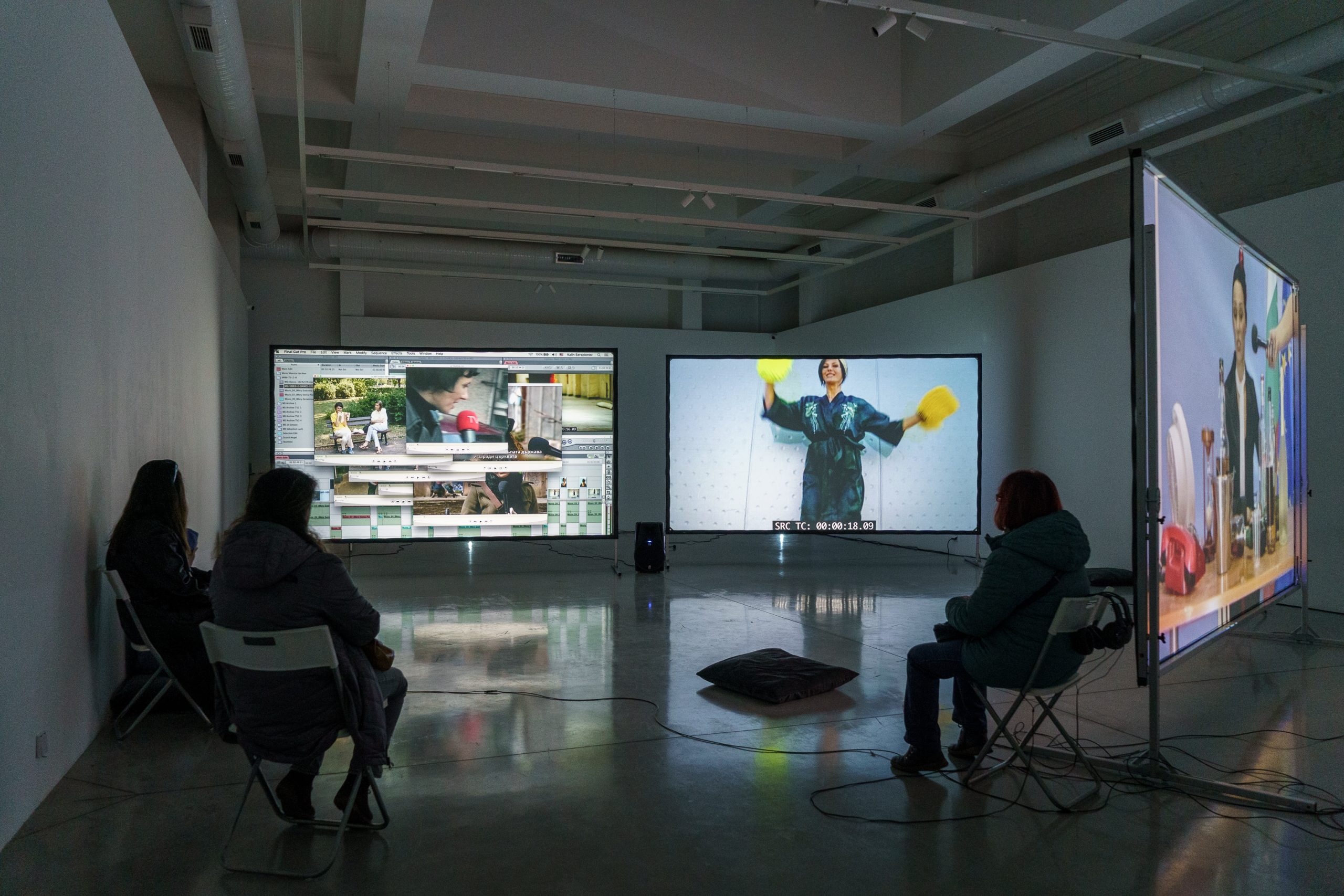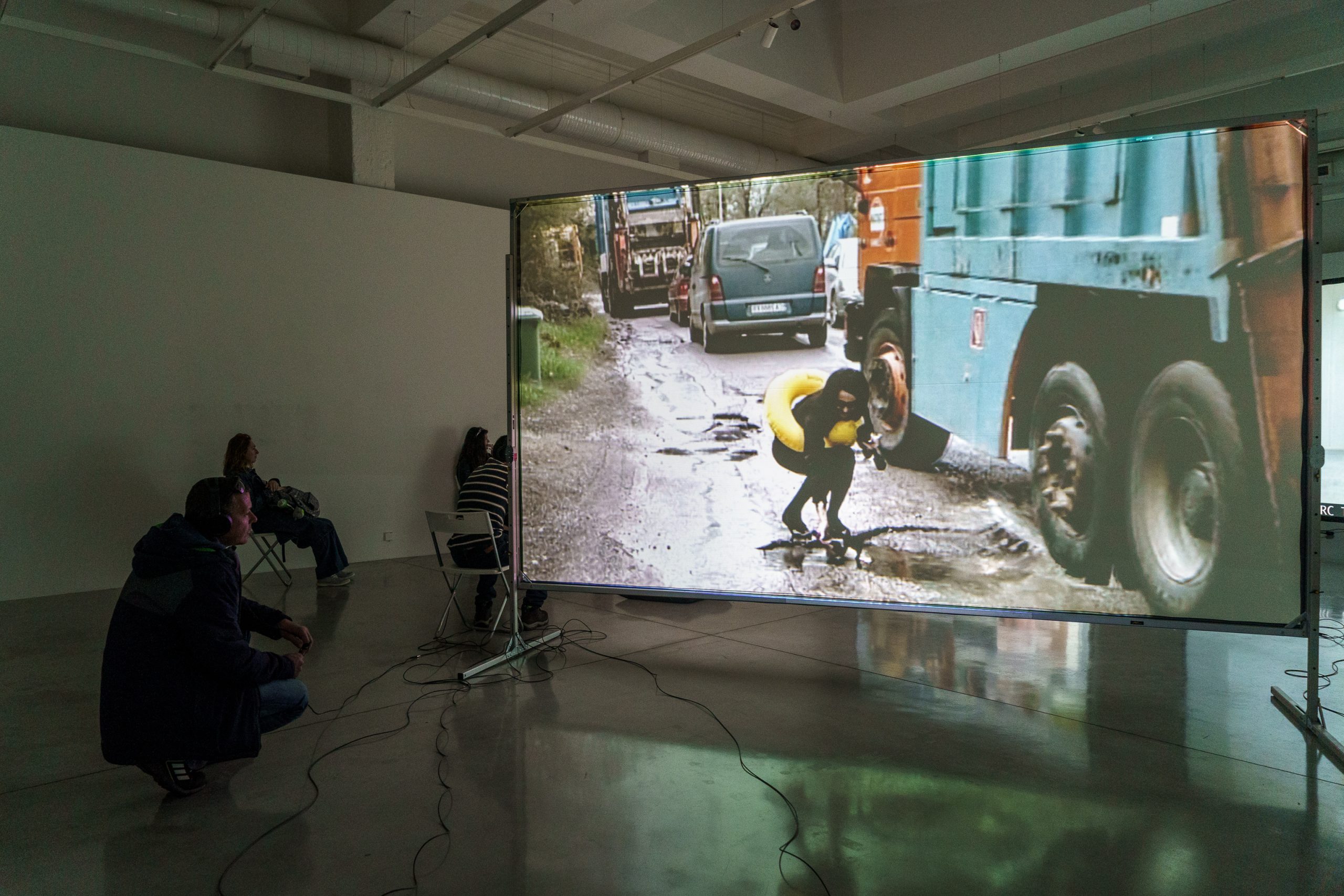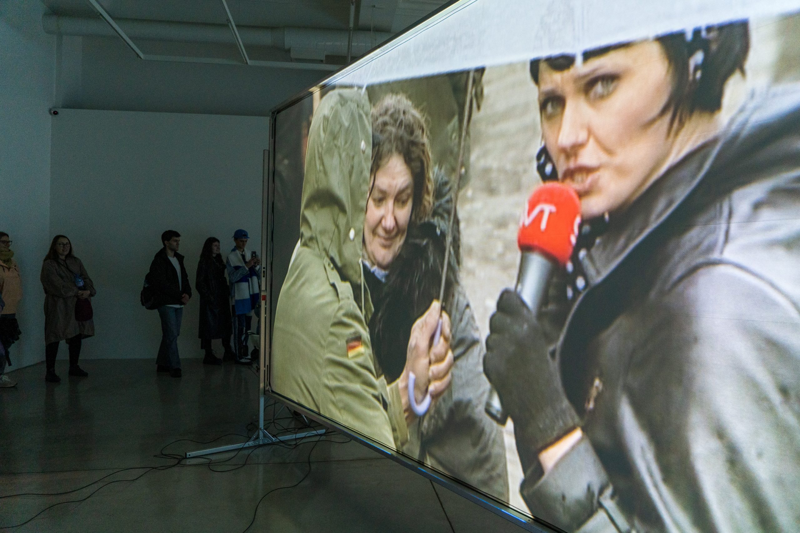 Мислех си за „триъгълника на тъгата“, или още „идиотския триъгълник“, по името на нашумелия филм на Рубен Йостлунд; разбира се – пряка връзка между двете няма; там става дума за телесно-душевното разкапване на безумно богатите, тук – за телесно-душевното разкапване на безумно бедните. Общото между двете е, че са безумни, първо, и второ, че са телесно-душевно разкапани. А ние къде сме? Седим някъде по средата, там, където ни е „отредено“ да бъдем в качеството ни на зрители, консуматори на култура и така нататък, на хора, на които констипацията е добре позната, защото навсякъде все така продължава да бъде леденостудено. Да, става дума за местоположението, за едно „къде си“, от което не можеш да избягаш „както и да си“: влизаш в галерията и се озоваваш срещу три екрана, разположени в триъгълна конфигурация. Ето защо се сетих за триъгълника на тъгата, тоест за идиотския триъгълник – хрумна ми докато гледах отстрани и се кикотех спорадично заедно с всички останали консуматори, приятели на авторите, роднини (винаги има роднини), интелигенти, професори и доценти (понякога има професори и доценти). Така в главата ми от нищото (или от всичкото) нахлу този израз – „идиотският триъгълник“, т.е. „триъгълникът на тъгата“, всъщност Бермудският триъгълник на настоящето, в който човек изчезва безследно, досущ както изчезнали безследно са и героите в „МО!“. Мислиш си, че всичко е приключило, че миналото е минало, че историята е в историята – а всичко всъщност се случва досами теб, всичко тепърва предстои. Докато пиша тези редове, например, до ушите ми достига далечен глас от включения в другата стая телевизор, който ми докладва, че някъде си (т.е. сравнително близко) глутница кучета изяли медицинска сестра. Нещата са твърде близки и заедно с това са безумно далечни, а безумието е тяхната близка далечност. Част от този опит е възсъздаден, перформативно осъществен в „МО!“