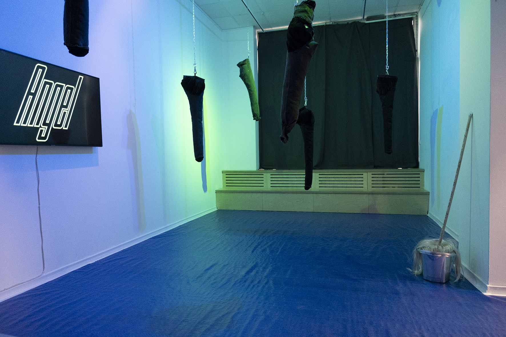 Вратата към изложбената на зала на КО-ОП е от две тежки прозрачни ленти, като тези, които се поставят на хладилните халета. Подът е покрит със син найлон, светлината в залата също е синя. Синьото София Димова свързва с интуицията, въображението, свободата и чувствителността. От тавана висят на куки за месо шест крачола от дънки. Тук са Livi’s – дънките на работниците, Miss Sixty и колекция Eden, разбира се – Адам и Ева в Рая, любов и изкушения. Видеата в изложбата са две. От първото се носи гласът на художничката, пееща на караоке песен на бойбандата Brockhampton: “Everything you wear, I’ll be the one to care. Softly, you raised your hair, all the angels stare…” Мелодията звучи на фона на стара презентационна реклама за ножове. „Спомням си как, когато бях малка, между сериалите на баба ми вървяха тези домакински реклами. Те бяха като кратка промивка на мозъка между различните части на историята. В същото време, песните на Brockhampton са много лирични. Парадоксално е, че това е момчешка група, която пее честно за чувствата си. Привлича ме контрастът между видеото и текста на песента, нежния текст и ножовете, които брутално разфасоват пилето.“ Оттук нататък зрителят може да си зададе и да отговори на различни въпроси. За мястото на съвременния човек в консумативното и материалистично общество, за репрезентацията на егото и чувствата и превръщането им в художествени образи.